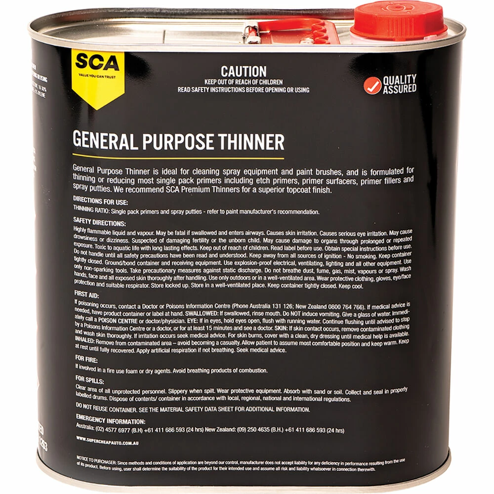 SCA General Purpose Paint Thinner is a great all round option to have handy in the garage or workshop. The perfect solution for cleaning spray and general painting equipment, this lacquer thinner will have your tools tidy and ready to use again with minimal effort. As well as being a great paint solvent for cleaning this product is fantastic for levelling out acrylic-base primers, and can also be used to thin out most single pack primers, fillers and spray putties. This 4L tin is a great value pack and stores easily thanks to the thin profile design, so grab a bottle before your next painting job.