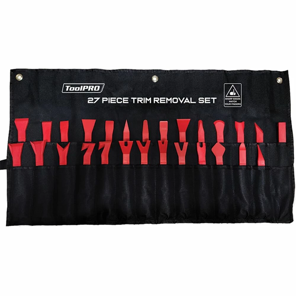 This ultimate ToolPRO Trim Remover Set allows you to remove fasteners and door trim clips from your vehicle or around the house quickly and safely. These tools are a safer alternative than using a screwdriver or pliers that may cause damage to your panels. The huge variety of designs offer proficiency at removing mouldings, badges and door panels and can adapt to remove items clipped or glued on. This set includes a massive 27 different plastic trim removal tools organised in a nylon storage roll.